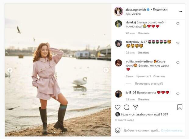 В этот раз Огневич позировала шерстяном костюме с шортами, а образ дополнила стильными резиновыми сапогами. Девушка гуляла у водоема, появившись на фоне лебедей. На нескольких кадрах Злата показала себя со всех сторон, демонстрируя стильный наряд. "Давно хотела себе именно такой шерстяной костюмчик. Считаю, это весенним must have, к тому же, с трендовыми резиновыми сапогами - очень круто смотрится!", - написала девушка. Фанаты сразу же принялись лайкать и комментировать публикацию певицы: "Вау", "Невероятная", "Замечательная", "Какая божественная девушка, очень красивая", "очень красивое фото", "Злата, вы само обаяние в этом костюме!", "Безумно красивая", "Красиво и нежно!", "Злата, размер сапогов точно твой?", "Какие фото. Теплые, мягкие цвета", "Божественна", "Ну очень красивая и нежная", "Я как раз ищу себе костюм. Благодарю. Как вовремя". Напомним, соблазнительная Огневич вскружила голову в гипюровом наряде. А еще Politeka писала, что Огневич раскрыла свою чувственную сторону в роскошном наряде с открытой спиной. Также Politeka сообщала, что бесстыжая Огневич залезла в ванную, устроив сеанс соблазна.