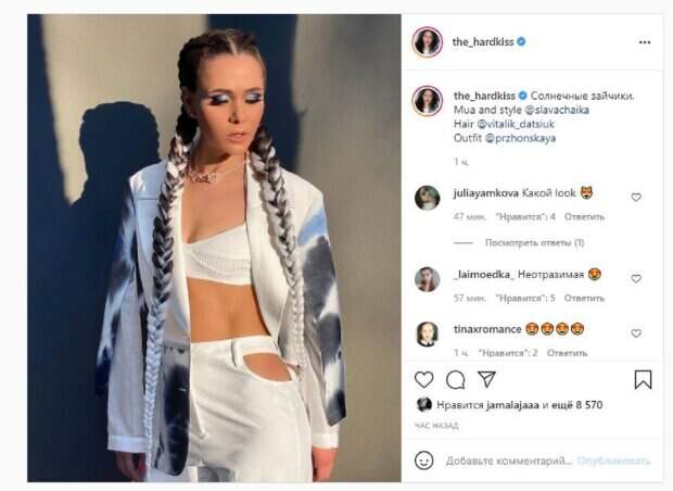 На новом фото, которое Санина опубликовала в социальных сетях, красотка позировала в штанах, топе и пиджаке, который распахнула. Девушка дополнила образ косами, а глаза закрыла от удовольствия. "Солнечные зайчики", - написала звезда под фото. Фанаты поставили более 8 тысяч лайков и написали комментарии: "Какой лук", "Неотразимая", "Огонь, с концертами по Европе когда?) Очень хочу попасть", "Самая красивая в этом мире", "Как нежно", "прекрасная) образ очень классный, впрочем, как всегда!", "Осторожно! Сегодня сатанинский день - даже зайчики с зубками)". Сообщалось, что солистка известной украинской группы The Hardkiss Юлия Санина, появилась в стильном образе. В этот раз в своем Инстаграм фронтвумен популярного коллектива предстала в длинной голубой рубашке, один из краев которых запрятала в джинсы. Последние были двух цветов - верх светлый, а низ - голубой. Белоснежные кроссовки на платформе отлично дополняли трендовый лук. Напомним, Юля Санина из The Hardkiss "убила" своим танцем живота, видео А еще Politeka писала, что Кароль предалась любимому делу с красавчиком-партнером Юлии Саниной Также Politeka сообщала, что Санина из The Hardkiss отбросила привычный стиль, поразив новым образом