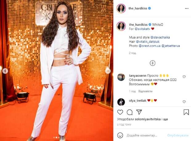 Как видно, на фотографиях Юлия позирует в интересном белоснежном костюме, под пиджаком которого необычная рубашка на веревочках, которая подчеркнула идеальный пресс. Волосы певицы распущены и мягкими кудрями спадают на плечи, а на ее лице легкий макияж. На одном из фото Санина запечатлена на сцене во время выступления, она как будто кокетничает со своим мужем-музыкантом. В подписи к публикации Юлия написала: "White", а также указала, кто помогал ей создавать этот очаровательный образ. Фанаты тут же принялись комментировать снимки артистки: "Очень крутой образ. Меньше космоса, но тебе очень идёт!", "Ну богиня ж", "Красотка", "Просто огонь. Обожаю, когда настоящая", "Шикарная какая", "Такая красивая", "Очень красивая". Напомним, Санина из The Hardkiss удивила внешностью в новом ярком образе: "Сильно похожа на Рианну". Как сообщала Politeka, Игривая Санина из The Hardkiss не сдержала эмоций рядом с мужем: "Ох, уж эти внутренние чертики". Также Politeka писала, что Санина из The Hardkiss удивила видом с необычной прической: "Зачем женщины такое с собой делают".