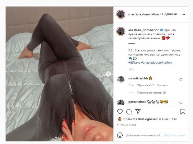 Известная певица и DJ Анастасия Кумейко, бывшая солистка группы Nikita, показала себя перед сном На фото звезда позировала в комбинезоне, лежа на кровати. Анастасия сделала акцент на пышном бюсте, который прямо выпирал из наряда. Кумейко на других фото начала выгибаться, а на последнем показала, как расстегивает комбинезон.