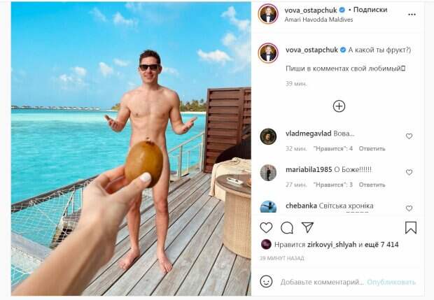 Украинский телеведущий Владимир Остапчук с женой Кристиной Горняк отправились на отдых на Мальдивы Пара радует поклонников снимками с островов, передает Politeka.net. В этот раз пара даже сделала довольно пикантное фото. В кадре предстал, вероятно, полностью обнаженный телеведущий. Глаза Владимира были скрыты за темными очками.