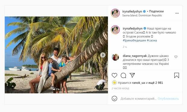 Сейчас супружеская пара растит двоих сыновей – Юрия и Олега. Ирина нередко делится семейными снимками. В этот раз звезда позировала в ярком купальнике и шортиках, сверкнув стройностью. Красотка присела на пальму и улыбнулась. Рядом с ней находилось счастливое семейство. "Наши приключения на острове Саона
