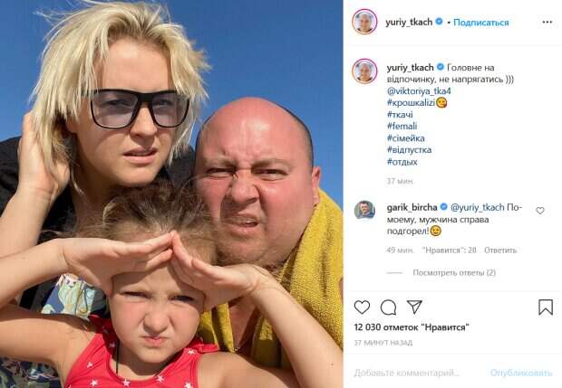При этом все трое заметно жмурятся и смотрят в камеру с недоверчивыми выражениями лица. Лицо самого Ткача при этом выглядит красным, то ли от солнца, то ли от наплыва эмоций. «Главное на отдыхе, не напрягаться», - подписал фото юморист. Его подписчики тут же принялись оставлять под снимком свои комментарии. «По-моему, мужчина справа подгорел!», «Не поймешь, на кого больше красотка похожа) мама с папой ооочень похожи, это значит, что семья будет ооочень счастливой!», «Боже ну какие же вы класнявые», «Боже у вас прям одинаковые лица», «Дочка у вас красавица», - пишут люди. До этого мы писали, что Ткач опубликовал в своем микроблоге в Инстаграм свежий снимок, на котором позирует рядом с супругой Викторией. Парочка предстала крупным планом - невозможно не заметить удивительного сходства между ними, более того, кажется, что они даже одинаково выпучили глаза. Виктория ухватилась пальцами за подбородок мужа, будто бы "растягивая" его в улыбке, при этом сама также кривлялась на камеру. Напомним, Ткач с выпученными глазами из "Квартал 95" удивил сходством с женой. Как сообщала Politeka, Кошевого из «Квартал 95» застукали с Ткачом в гримерке, вид впечатляет. Также Politeka писала, что Юрий Ткач из «Квартал 95» удивил выходкой на съемках: «Гнида, убери…».