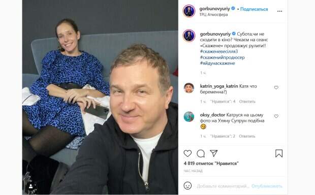 Пока ведущий делает селфи его жена удобно расположилась на диванчике в кинозале. Для похода в кино она надела синее платье с большим поясом и леопардовым принтом. Ведущая выглядит счастливой, и радостно улыбается. «Суббота, почему бы не сходить в кино? Ждем сеанса», - подписал снимок Горбунов. Стоит отметить, что в комментариях обратили внимание на фигуру его жены. Некоторым показалось, что руками она прикрывает округлившийся животик. Слухи о беременности Осадчей ходят уже давно, однако пока ведущие ничего не говорят на этот счет. «Катя что беременна?», «Катюша на этом фото на Уляну Супрун похожа», «Вчера тоже смотрели в кинотеатре, супппппер фильм - 2 часа смеха», «Какое у Кати красивое платье», «Катя красотка», «Карантин, сиди дома», - пишут люди под постом ведущего. Напомним, как выглядит "райское гнездышко" Горбунова и Осадчей, в сеть слили фото особняка: "От чужих глаз прячут два...". Как сообщала Politeka, дерзкий Горбунов устроил выволочку Потапу, который вырядился, как Осадчая: "Слышишь...". Также Politeka писала, что раскрасневшаяся Осадчая прижалась к красавчику из "Мастер Шеф": "Ах!!! Какой мужчина".