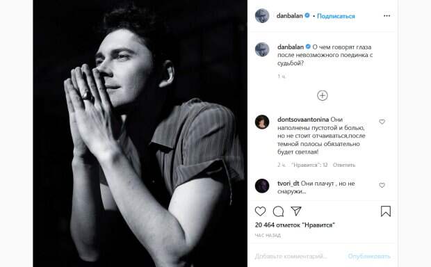 «О чем говорят глаза после невозможного поединка с судьбой?», - загадочно написал артист. На новом черно-белом снимке он сидит, задумчиво глядя в сторону. Певец сложил руки перед собой и немного улыбнулся, добавив своему образу нотку романтики. На кадре можно заметить, что одет Балан в темную рубашку в полоску. Поклонницы певца не смогли пройти мимо такого поста. «Дан что у тебя случилось?», «Наши глаза говорят сейчас о шоке. Приятном шоке», «Ну какой же ты красивый», «Дан поделись зельем молодости», «Ооууу май... Котярааа, наш любимый», «Так хочу чтоб с Тиной был... такая красивая пара», - пишут люди. Ранее мы писали о том, что с момента совместного появления Кароль и Балана на шоу «Голос країни» поклонники не перестают находить все новые доказательства их тайного романа. Балану пришлось ответить на вопрос о том, был ли их роман с Кароль реальным и стоит ли поклонникам ждать его продолжения. Впрочем, певец явно не хотел приоткрывать завесу тайны, поэтому его ответ был очень расплывчатым. «Пусть это останется в книге. В книге, написанной рукой гения», - заявил Балан. Напомним, Дан Балан признался, на что пошел ради Тины Кароль, и пролил свет на их роман. Как сообщала Politeka, 45 белокурая мама Дана Балана сверкнула ножками в кружевном платье на зависть молодым. Также Politeka писала, что Дан Балан, "променявший" Тину Кароль на молодую красотку, попался Осадчей.