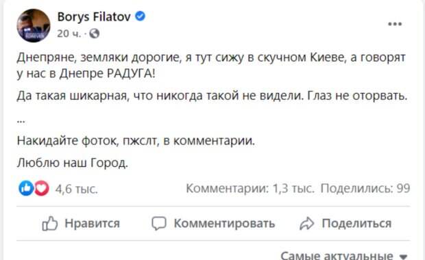 Он призвал пользователей сети прислать ему снимки этого яркого атмосферного явления, так как лично насладиться зрелищем не может, ведь уехал из города. "Говорят у нас в Днепре Радуга! Да такая шикарная, что никогда такой не видели. Глаз не оторвать. Накидайте фоток, пожалуйста, в комментарии. Люблю наш город", - написал он в своем Facebook. Обильные майские грозы породили много невероятных радуг, потому аользователи интернета стали активно размещать под постом красочные кадры необычайной радуги в днепровском небе после майской грозы, и делиться впечатлениями. Ранее похожее чудо наблюдали жители Харькова. Город накрыли черные тучи, а в некоторых районах выпал град. После того как непогода утихла, небо украсила огромная радуга. В некоторых местах даже двойная и тройная радуга. Напомним, что в Днепре кондуктор общественного транспорта устроил зажигательные танцы в конце рабочего дня. Как сообщала Politeka, в Днепре двое пьяных мужчин устроили скандал в ветеринарной клинике. Также Politeka писала, что в Днепре разыскивают парня, который поехал на службу в воинскую часть и пропал по дороге.