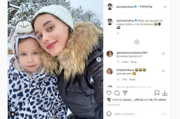 7-летняя Анастасия запечатлена в курточке леопардовой раскраски и забавной шапке в виде головы медведя. Актриса сделала несколько селфи с дочерью на фоне заснеженных деревьев и загородного особняка, при этом красотки принялись корчить на камеру различные рожицы. "Мам, мы вышли на улицу гулять, а не фоткаться