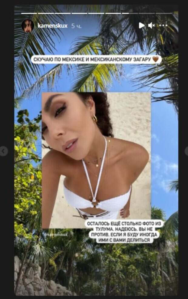 Певица Настя Каменских очаровала публику загорелой фигуркой 34-летняя звезда опубликовала любопытное фото в "сториз" у себя в Инстаграм, на котором предстала в белом купальнике, передает Politeka.net. Настю накрыла волна ностальгии по отдыху в экзотической Мексике. Как известно, певица прожила почти месяц в Тулуме этой весной, снимая свое реалити "Девчоки рулят".