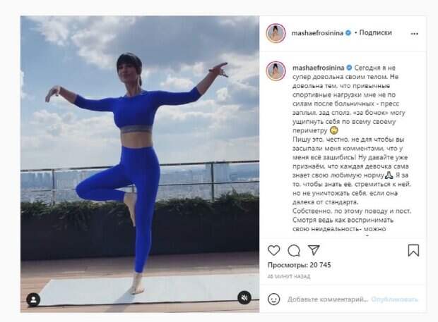 Девушка показала несколько поз, как занимается йогой. "Сегодня я не супер довольна своим телом. Недовольна тем, что привычные спортивные нагрузки мне не по силам после больничных - пресс заплыл, зад сполз, «за бочок» могу ущипнуть себя по всему своему периметру. Пишу это, честно, не для чтобы вы засыпали меня комментами, что у меня всё зашибись! Ну давайте уже признаем, что каждая девочка сама знает свою любимую норму. Я за то, чтобы знать её, стремиться к ней, но не уничтожать себя, если она далека от стандарта", - написала Маша под фото. Фанаты посмотрели ролик десятки тысяч раз и написали комментарии: "Я так люблю когда супер худые женщины пишут что не довольны телом", "Восхитительная женщина", "Боже, Маш, довольны вы или нет - вы офигенно красивая женщина", "А у меня первая мысль - какая идеальная форма!". Напомним, неприятности у Ефросининой, звезда срочно обратилась к украинцам А еще Politeka писала, что 41-летняя Маша Ефросинина впечатлила внешностью в "диком люксе" Также Politeka сообщала, что тренер "Лиги Смеха" Ефросинина устроила знойный стриптиз, никакого стеснения