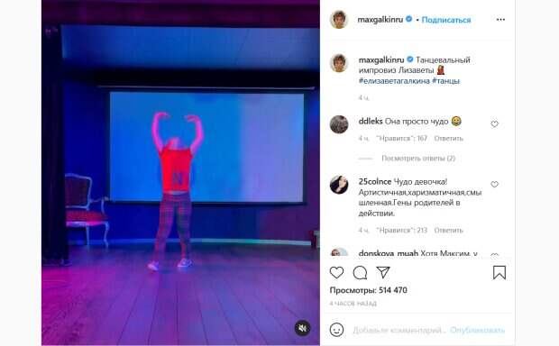 На этот раз Галкин решил показать актерские и танцевальные таланты своей дочери. Как сообщает Politeka.net, юморист опубликовал в своем Инстаграм соответствующее видео. На кадрах можно увидеть, как Лиза выступает в комнате, оформленной под импровизированный мини-домашний театр. Девочка танцует под музыку, разбавляя свои танцы явными театральными движениями и артистичной импровизацией. Стоит отметить, что двигается маленькая Лиза весьма уверенно. «Танцевальный импровиз Лизаветы», - подписал кадры Галкин, который явно гордится талантами дочери. Поклонники звездного семейства активно комментируют новое видео. «Она просто чудо», «Чудо девочка! Артистичная, харизматичная, смышленая. Гены родителей в действии», «Хотя Максим, у такого человека как Вы не могло быть других детей», «Господи, МАМОЧКИНА дочка)))) какое чудо», «Господь сотворил Самое прекрасное создание на Земле», «Какая красивая девочка. Пластика и талант налицо», «Уже видно, что растёт будущая звезда», «Огонь девчонка! Она ещё покажет всему шоу-бизнесу», «Вся в папу», - пишут люди. Напомним, Пугачева во всем черном под руку с Галкиным заставила тревожиться фанатов: появилось фото. Как сообщала Politeka, дочь Пугачевой и Галкина поразила внешностью в стильном образе на прогулке: "Мальчишки, держитесь". Также Politeka писала, что совсем маленькая дочь Пугачевой и Галкина поразила своим поведением: "Лизонька рано...".