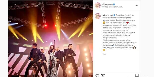 Также Гросу сказала, что желающим вернуть средства за билеты обращаться в кассу. "Дорогие мои друзья, по техническим причинам концерт 5 июня в городе Фастов переносится