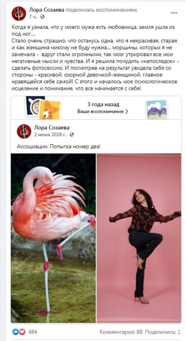 В итоге пара прожила 18 лет, а в 2011 году рассталась, но померилась и даже обвенчалась во время отдыха в Турции. В браке у Ларисы и Виктора в 1999 году родился сын Павел Павлик, который, к сожалению, скончался в прошлом году в результате рака, на тот момент артист ушел из семьи окончательно. В своем Фейсбуке Созаева вспомнила о непростом периоде, когда узнала об измене мужа. Артистка подкрепила пост фото, сделанными три года назад. "Когда я узнала, что у моего мужа есть любовница, земля ушла из-под ног... Стало очень страшно, что останусь одна, что я некрасивая, старая и как женщина никому не буду нужна...", - написала бывшая жена певца. После этого Лора решила сделать фотосессию и посмотреть на себя со стороны. В итоге она поняла что хорошо выглядит, после чего началось ее психологическое исцеление и понимание. "Некрасивая, старая??? Вы чтоооо", "Какая ты молодец))", "Вы достойны самого лучшего, любящего)", "Как можно сравнивать розу с репяхом?)", "Где-то я когда- то читала,брошенная женщина,как рассыпанный пазл,а потом-,,ОП!,,и новая-,,КАРТИНКА!,, Умница!Красавица!", "Женщина молодая, пока у нее озорные глаза!)", - написали пользователи сети. Напомним, 55-летний Виктор Павлик сейчас женат на своем концертном директоре, 26-летней Екатерине Репяховой, которая ждет ребенка. Напомним, Павлик в блестящем наряде заявился к беременной жене с неожиданным сюрпризом: "Только это не от...". Как сообщала Politeka, "глубоко" беременная жена Павлика оторвалась на крутой вечеринке: "Теперь уверенно можно...". Также Politeka писала, что 55-летний Павлик с молодой женой отпраздновали "ситцевую" свадьбу, появились фото: "Еще много-много лет...".