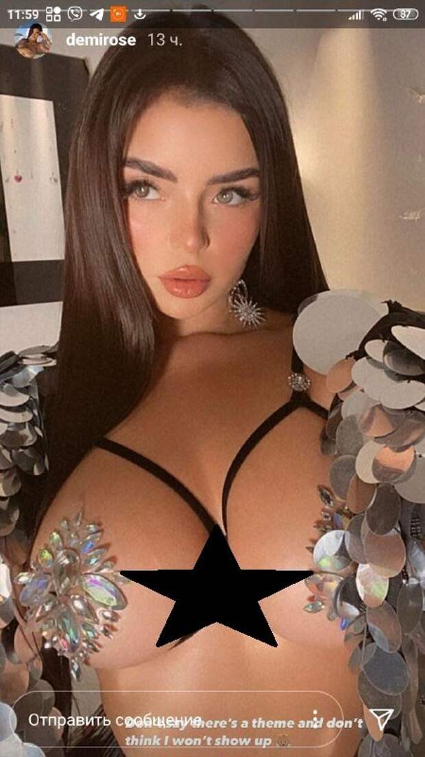 Модель надела на грудь тонкие лямки, напоминающих формой лифчик, однако сами по себе они представляли лишь "каркас" для белья. На обнаженные грудь звезда прилепила сверкающие камушки, которые скрыли от глаз пикантные места. С плеч спала серебряная накидка. Грудь "торчала" и выглядела очень соблазнительно, притягивая взгляд, так и хочется сказать: "Ого, какой бюст!". Также Роуз надела сверкающие, похожие на железо, мини-шорты, под которыми выглядывали колготки. Модель распустила длинные черные волосы, закинув одну часть за ушко и засветив сверкающую сережку. Фото не собрали много лайков и открытых комментариев, так как в сториз нет такой возможности. Однако можно с уверенностью сказать, что кадры произвели фурор. Ранее мы писали, что Деми Роуз показала, что может покорять далеко не одним бюстом. Так, красотка продемонстрировала свои ягодицы. Модель появилась в белом комплекте со стильной разноцветной вставкой на укороченном топике. Благодаря пикантному ракурсу она получила много приятных сообщений. Напомним, Деми Роуз удалось впечатлить домашним селфи, на котором она позировала в кружевном лифчике со вставками в форме маленьких цветков и с камнями прямо возле них. Напомним, мокрая Деми Роуз показала идеальный "орешек" в белоснежном бикини. Как сообщала Politeka, Деми Роуз не смогла удержать "черешенки" в красном бикини с вырезом. Также Politeka писала, что Деми Роуз покорила размерами своих прелестей, забыв о лифчике