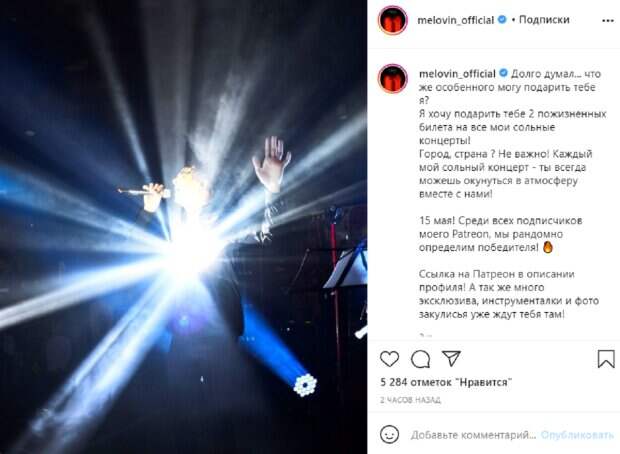 Город, страна ? Не важно! Каждый мой сольный концерт - ты всегда можешь окунуться в атмосферу вместе с нами!», - написал артист. «15 мая! Среди всех подписчиков моего Patreon, мы рандомно определим победителя!