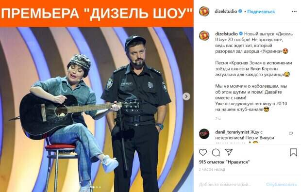 При этом за ее спиной стоит суровый полицейский. «Вас ждет хит, который разорвал зал дворца «Украина». Песня «Красная Зона» в исполнении звезды шансона Вики Короны актуальна для каждого украинца. Мы не молчим о наболевшем, мы об этом шутим и поем! Давайте вместе с нами!», - говорится в подписи к фото. Поклонники юмористов тут же принялись комментировать пост. «Жду с нетерпением! Песни Викуси самые лучшие», «Булитка, Карантиная, Корона. Какие ещё фамилии скрываются в этой прекрасной девушке?», «Ждём пятницу, очень», «Буду ждать», - пишут люди. Ранее мы сообщали, что звезда «Дизель шоу» Яна Глущенко показала нового члена семьи. Знаменитая украинская блондинка зарядила позитивом своих поклонников. Красотка поделилась радостной новостью и подкрепила ее свежими фото. Глущенко недавно взяла себе в дом красивого щенка, которым, вероятно, сама не может налюбоваться. Артистка позировала на улице, надев желтую шапку и оранжевую куртку. Она по очереди взяла в руки малышей, когда выбирала, и счастливо улыбалась. Напомним, у звезды "Дизель шоу" пополнение в семье, появились фото малыша: "Похожи...". Как сообщала Politeka, звезда "Дизель шоу" Булитко сразила наповал роскошным видом в парике и пикантном платье: «Шальная императрица». Также Politeka писала, что звезды "Дизель шоу" ошарашили перевоплощениями для яркого номера: "Курьеры, будьте осторожны".