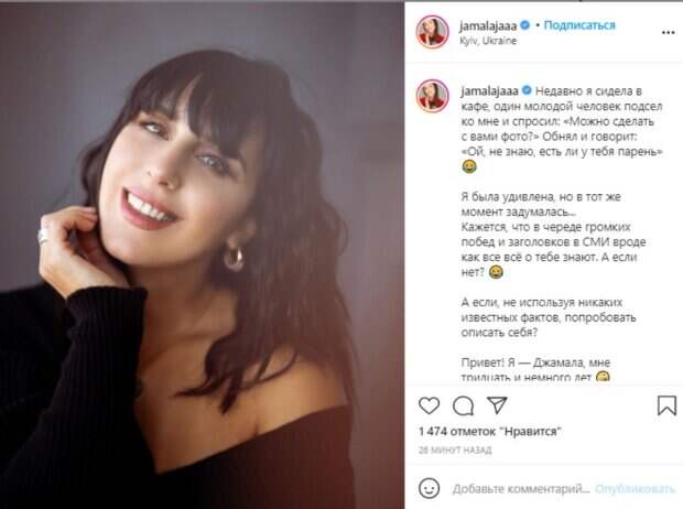 В подписи артистка поделилась любопытной историей, которая вызвала у нее недоумение. Оказывается, в кафе к ней "клеился" незнакомец, который, похоже, так и не понял, что перед ним была победительница "Евровидения". "Недавно я сидела в кафе, один молодой человек подсел ко мне и спросил: «Можно сделать с вами фото?» Обнял и говорит: «Ой, не знаю, есть ли у тебя парень»