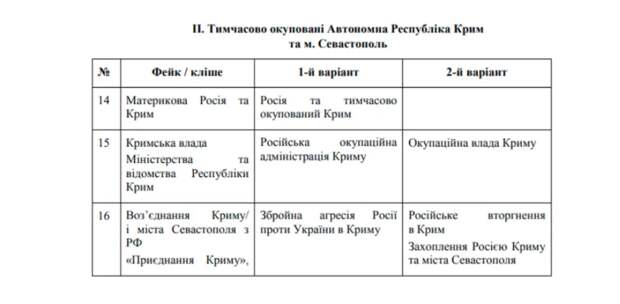 Украинское правительство совместно с министерствами и Академией наук страны выпустило словарь выражений, которые не рекомендуется использовать журналистам, дипломатам и чиновникам. Авторы необычного глоссария уверены, что он позволит «противостоять РФ» в мировом информационном пространстве. Документ представлен в виде таблицы, состоящей из трех столбцов.