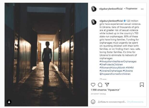 Об этом пишет Politeka.net со ссылкой на страничку знаменитости. "120 миллионов девочек подверглись насилию. В Украине десятки тысяч девочек подвергаются большему риску насилия, будучи запертыми в 700 государственных детских домах. 90% этих девушек имеют живые семьи. Финансирование детских домов необходимо срочно направить на воссоединение детей с их биологическими семьями или на поиск новых, безопасных, любящих приемных семей. Пора Украине ликвидировать сеть детских домов", - написала Ольга. Фанаты поставили почти 2 тысячи лайков и написали комментарии: "Ольга, если вы собираетесь делать только одно, это должно спасти жизнь ребенка. Эта малышка любит улыбаться, грызть пальцы и поддерживать такой милый и игривый зрительный контакт. Я никогда не думал, что смогу стать волонтером, но у всех нас есть выбор. Я хочу помочь. Пожалуйста, позвольте мне рассказать вам историю Адель", "Любим тебя", "Это позорно, но как это остановить", "Так как я могу искренне помочь тебе?", "Предыстория ужасна, и я желаю всем, кто нуждается в помощи, получить ее раньше, чем позже". Напомним, украинская девушка Бонда Куриленко с короткой стрижкой впечатлила игривым видом А еще Politeka писала, что украинская девушка Бонда Куриленко не выдержала из-за проблем на родине, появился крик души Также Politeka сообщала, что украинская девушка Бонда Куриленко вспомнила о родине, удивив душераздирающим заявлением