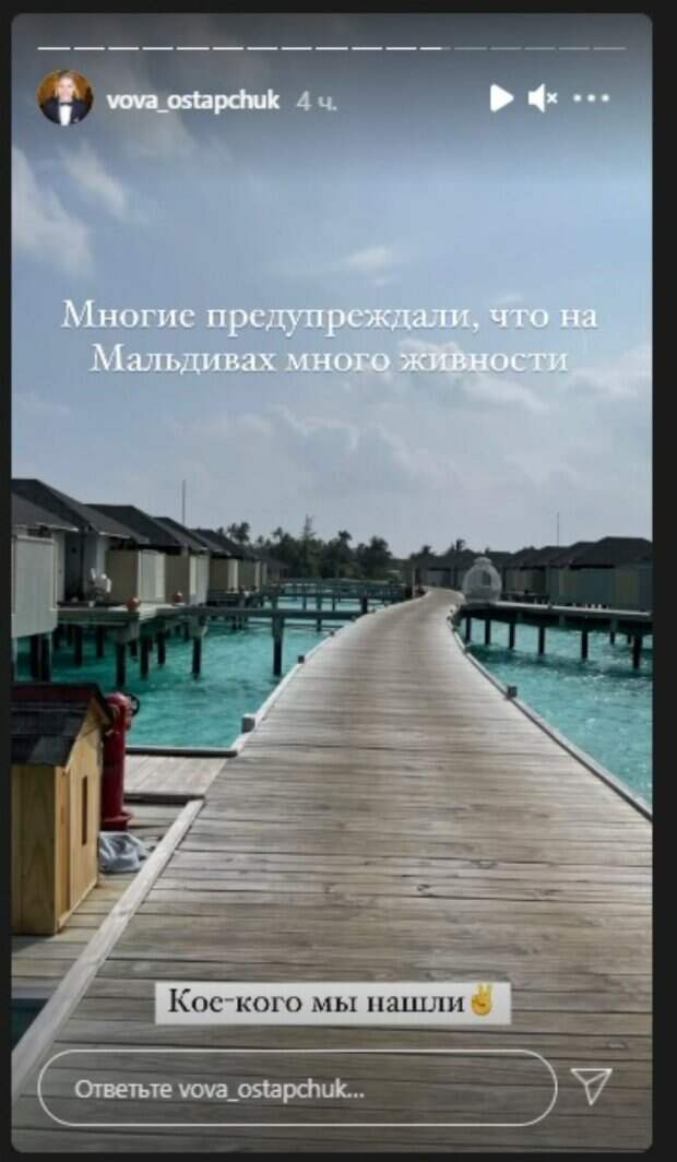 Владимир отметил, "многие предупреждали, что на острове много живности". И это оказалось правдой. В своих "сториз" ведущий показал отель на воде и, главное, того, кто под водой. Так, он стоял на мостике, окруженном бунгало с обеих сторон и с удивлением снимал происходящее внизу. Там проплывали детеныши акул. Несмотря на то, что они маленькие, все равно сердце при взгляде на них уходит в пятки. "Скатов не видели, акулы милые, издалека...", - подписал кадры Остапчук. Далее, и он, и его супруга повосторгались еще одним обитателем райского уголка. На пальме парочка засняла висящую вниз головой летучую собаку. "Летучая собака Михалыч", - посмеялся над животным Владимир. "Я очень боялась их встретить, но это неизбежно... Смотрите... Она была очень нами недовольна и потому улетела... В этот момент, когда она открыла крылья, я чуть не...", - поделилась, в свою очередь, Кристина. Ранее мы рассказывали, "одичавший" на Мальдивах Остапчук полностью разделся, прикрыв срам "мохнатым" киви. "Блин, какой то киви волосатый. Или то не киви