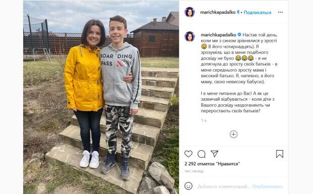 Ведущую это сильно впечатлило, ведь сама она так и осталась ниже своих родителей. «Настал тот день, когда мы с сыном сравнялись в росте. В его четырнадцать). Я поняла, что у меня подобного опыта не было - я не дотянула до роста своих родителей - у меня среднего роста мама и высокий отец. Я, наверное, в его маму, свою невысокую бабушку», - рассказала Падалко. Она также поделилась снимком, на котором они с сыном позируют рядом. На фото мальчик кажется даже немного выше своей мамы. При этом, ведущая выглядит очень счастливой и явно гордится сыном. Ее подписчики тут же отреагировали на пост Марички. «Это замечательно, что наши дети нас перегоняют по росту!», «Главное здоровье», «По-моему он уже перерос))) такой парубок, не сглазить бы», «Сынуля выше», - пишут люди. Напомним, звезда "1+1" Маричка Падалко показала, как поддерживает форму во время карантина: "Ну и фигура...". Как сообщала Politeka, звезда "1+1" Маричка Падалко показала, как выглядит в обычной жизни, честное фото: "Сколько можно...". Также Politeka писала, что ведущая "1+1" Маричка Падалко расплакалась в прямом эфире после трагедии: "Спецвыпуск...".