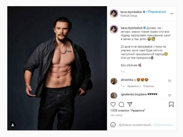 Кадр получился довольно брутальным и увлекательным, ведь видно, что актер следит за собой. Об этом пишет Politeka.net со ссылкой на страничку знаменитости. "Думаю, мы - актеры, имеем полное право есть все подряд, пропускать тренировки, когда в запасе есть такие фото. 25 дней я не тренировался. И пока не представляю, когда мне будет светить следующий тренировочный период. Но это тоже прекрасно. Всех обнял", - написал Тарас. Фанаты поставили более тысячи лайков и написали комментарии: "Годная форма", "Красавчик", "Это красиво", "Воистину эталон мужской красоты". Мы писали, что украинский актер Тарас Цымбалюк впечатлил новым брутальным образом. Цымбалюк предстал перед камерой в стильном черном свитере и дополнил брутальный образ массивными перстнями и цепью на шее. Благодаря бороде и густой черной шевелюре актер выглядит очень мужественно. Напомним, звезда «Спіймати Кайдаша» Тарас Цымбалюк поразил видом на съемках и в обычной жизни А еще Politeka писала, что раздетый Тарас Цымбалюк из «Спіймати Кайдаша» засветил железный торс, лишив женщин сна Также Politeka сообщала, что звезда «Спіймати Кайдаша» Цымбалюк прижался к белокурой невесте, показав настоящие чувства