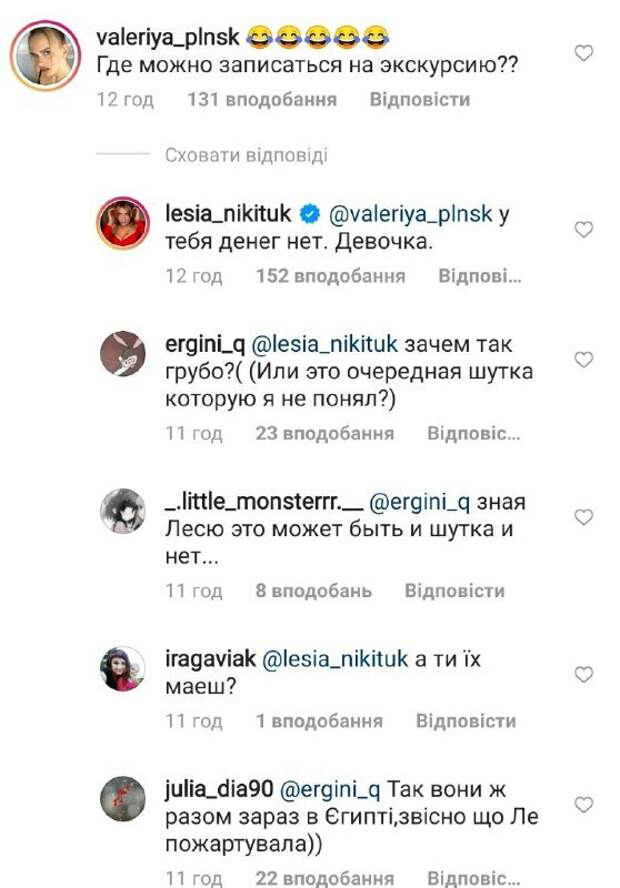 Однако в комментариях к публикации телезвезды разгорелся скандал из-за ее шутки. В ролике Леся в качестве экскурсовода привезла туристов на автобусе показать местные достопримечательности Хургады. Однако, в своей роли телеведущая обращается к приехавшим на экскурсию весьма дерзко и надменно, все время требуя денег. В подписи к видео Никитюк спросила: "Поехали бы со мной на экскурсию?". Конечно же поклонники принялись активно обсуждать новую публикацию звезды, однако, под видео разгорелся даже скандал. Дело в том, что одна из пользовательниц написала: "Где можно записаться на экскурсию?". На это Леся ей по-хамски, но явно в шутку ответила: "У тебя денег нет, девочка". Такой выпал Никитюк очень не понравился пользователям, и они принялись высказывать свое мнение. И если одни решили, что это шутка, а телеведущая на самом деле знакома с девушкой, которой нахамила, то другие осуждают такой комментарий звезды. Напомним, Загорелую Никитюк в мини-бикини заподозрили в популярном обмане: "До неузнаваемости, печаль...". Как сообщала Politeka, Леся Никитюк нарвалась на критику из-за дерзкого наряда на прогулке по храму: "Ужасный прикид". Также Politeka писала, Мускулистый судья "Мастер Шеф" Хименес-Браво прижал к себе Никитюк: "Для идеального вечера важна…".