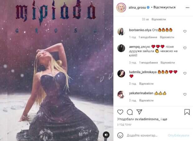 Алина одета в платье, подчеркивающее ее тоненькую фигуру. Звезды, которые мириадами летят вокруг, создают фантастический образ. Конечно же песня красавицы-певицы о любви. Она на родном языке, пожтому и пост свой Алина написала на украинском: "Міріада - незліченна кількість будь-чого