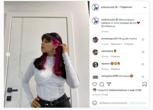 Мишель Андраде не забывает и о социальных сетях, которые активно ведет, подогревая к своей персоне интерес. На фото красотка позировала в джинсах с ремнем и белой кофточке. Красотка рукой поправила волосы, чтобы показать розовые пряди, которые выкрасила. На втором фото Мишель стояла спиной, демонстрируя цвет волос с другой стороны. "Максимально кайфую от этих розовых волос", - написала Мишель под фото. Фанаты поставили более 4 тысяч лайков и написали комментарии: "Милашка", "мне очень нравится", "Вам идет", "Нереальная", "Тебе идет", "Какая привлекательная и очень красивая красавица", "Вы, Мишель, словно сияете, как чистый, блестящий алмаз". Мы писали, что популярная украинская певица, Мишель Андраде, похвасталась фигурой. В своем Инстаграм Мишель опубликовала фото, на котором предстала в коротком топе, сверкая упругим животиком, а тонкую талию подчеркнули джинсы на высокой посадке. Напомним, Мишель Андраде с гордостью рассекретила своего учителя, и это не Потап А еще Politeka писала, что подопечная Потапа Мишель Андраде высунула язык, пошалив в коротком топе перед камерой Также Politeka сообщала, что соблазнительная подопечная Потапа Мишель Андраде заставила дрожать не только от голоса