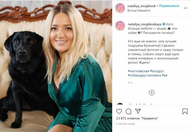 Певица Наталья Могилевская похвасталась, что ее новые снимки в очередной раз попали в глянец Об этом звезда рассказала в своем Instagram. Так, украинская звезда показала поклонникам свою лучшую "подружку-брюнетку", с которой проводит свободное время. По словам Натальи Могилевской, она со своей собакой участвовали в фотосессии, снимки из которой попали в глянцевый журнал.