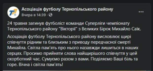 На Тернопольнище оборвалась жизнь молодого футболиста Как передает Politeka.net, об этом сообщили на Facebook-страничке Ассоциации футбола Тернопольского района. 24 мая погиб футболист команды Суперлиги чемпионата Тернопольского района "Виктории" из Великих бирок 23-летний Михаил Саик команды Суперлиги чемпионата Тернопольского района "Светлая память о нем навсегда останется в наших сердцах.