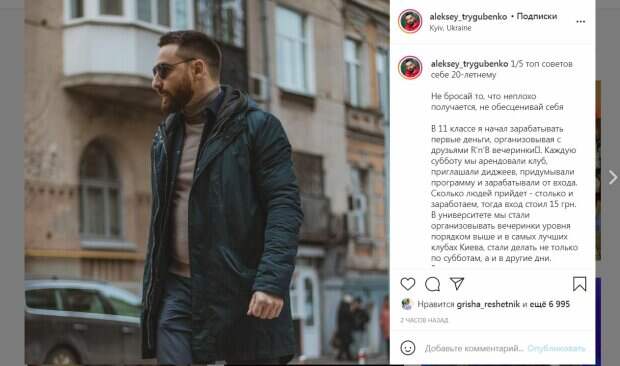 Не заработав победу, бизнесмен все же сумел завоевать любовь тысячи фанаток. Сейчас на его страницу подписаны 172 тысячи пользователей сети. В своем недавнем посте в Инстаграм Алексей решил поделиться советами себе 20-летнему, до того, как познакомился с Мишиной. Запись бизнесмен подкрепил снимком в стильном луке. В тексте бизнесмен порекомендовал не бросать начатое и не обесценивать себя. "В 11 классе я начал зарабатывать первые деньги, организовывая с друзьями R’n’B вечеринки