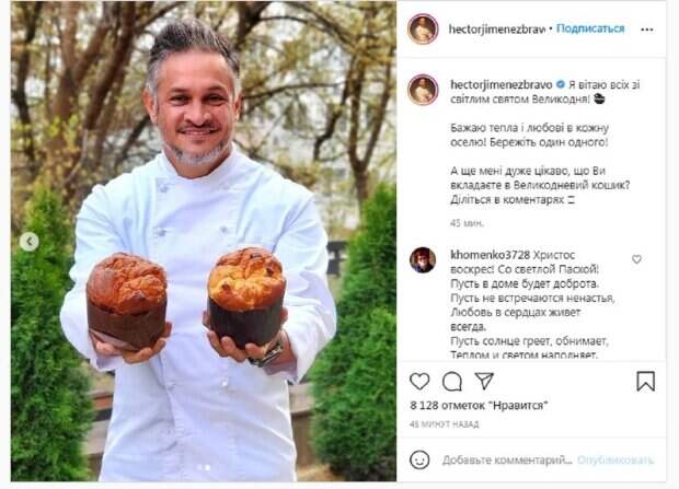 Ресторатор, судья шоу "Мастер Шеф" Эктор Хименес-Браво обратился к украинцам в день Пасхи Как передает Politeka.net, кулинар, который уже много лет живет и работает в Украине поздравил всех с праздником, и показал свою пасхальную корзину. «Я поздравляю всех со светлым праздником Пасхи!