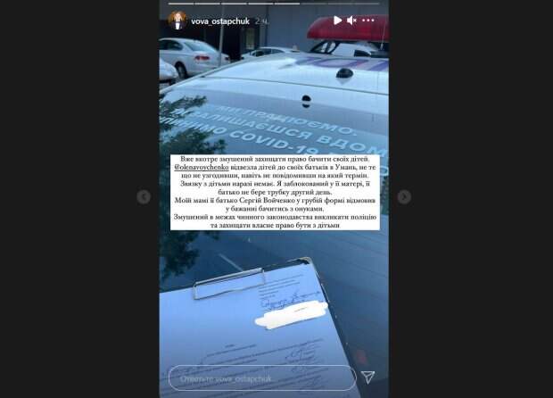 На днях он даже написал заявление в полицию. 2 июля эта история получила продолжение. Как пишет Politeka.net, в своем Инстаграм ведущий сообщил, что бывшая жена без предупреждения увезла детей в Умань к родителям, и теперь у него нет с детьми никакой связи. «Моей маме ее отец Сергей Войченко в грубой форме отказал в желании видеться с внуками. Вынужден в рамках действующего законодательства вызвать полицию и защищать собственное право быть с детьми», - написал Остапчук в своем Инстаграм. Он также возмутился тем, что отец Елены якобы позволил себе грубости в адрес его матери. На этот раз бывшая жена ведущего не стала молчать. Она ответила на его заявления уже в своем Инстаграм. Женщина считает, что ведущий намеренно втягивает детей в публичные разборки ради пиара. «К сожалению моих детей и меня уже почти два года непрерывно терроризируют и втягивают в публичное обсуждение вранья бывшего мужа ради его пиара. Теперь он решил строить из себя жертву, врать даже полиции и защищаться от самого себя. Владимир, остановись! Хватит врать!», - возмущенно написала Войченко. Пока неизвестно, на чью сторону в этих разбирательствах встанут правоохранители, ведь ранее Войченко обвиняла бывшего мужа в злостной неуплате алиментов. Напомним, Владимир Остапчук решил разобраться с бывшей женой, дело дошло до полиции. Как сообщала Politeka, Остапчук с бокалом в руке показал, с какими красотками встречает вечер. Также Politeka писала, что Остапчук неожиданно показал "легкую придурь" своей новой жены.