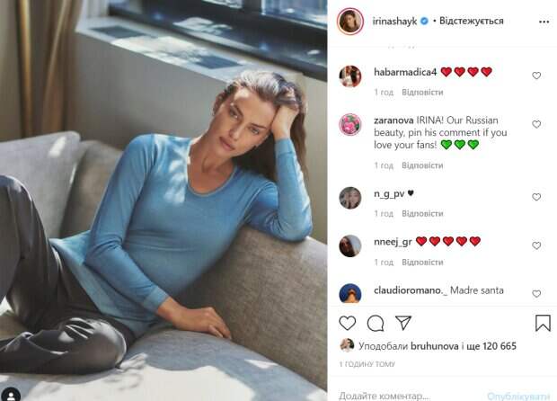 Особое внимание поклонников привлекли светящиеся глаза модели, которые гармонировали с цветом ее одежды. За час ее фото собрало более 120 тысяч лайков. В комментариях ей оставили массу приятных слов. «Богиня», «Очень красивая», «Красотка нереальная», «Глаза огонь», «Вы действительно отдыхаете», «красота», «Ирина! Русская красавица», «Мадам, а где ваша дочка Лея?», «Доброе утро, Ирина, Ты сегодня посинела», «Ты такая красивая», «Удивительная», «Вы мое вдохновение», «Сказочная принцесса», - пишут пользователи сети. Ранее мы писали, что Ирина Шейк сверкнула роскошью в кружевном бюстгальтере. Модель позировала на камеру, вероятно, снимаясь в очередной рекламе. На шее у нее красовалось аккуратное украшение, которое придало особого шарма фото с красоткой. Кроме этого, недавно Шейк представила новую коллекцию модного бренда. Модель позировала в миниатюрных шортиках и гетрах. Образ дополнили туфли на каблуках. Напомним, что роскошная Ирина Шейк подразнила упругостями в мини-шортиках и чулках: «Роналду оценит». А еще Politeka писала, что Ирина Шейк в леопарде поманила к себе в кроватку, кадры соблазна: "Какая кошечка". Также Politeka сообщала, что роскошная Ирина Шейк устроила взрослые танцы в латексе и произвела фурор: «Очень сладко».