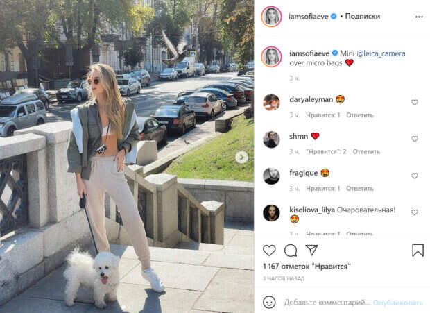 Девушка активно ведет социальные сети и делится с поклонниками моментами из жизни. На этот раз модель опубликовала новые фотографии на своей странице. Как известно, у себя в Инстаграм модель часто показывает, как занимается спортом. На кадре Соня в микро-топе розового оттенка показывает свой подтянутый пресс. Она гуляет со своей собакой по имени Джимми по центру Киева. Поклонники засыпали девушку приятными словами в комментариях: "Очаровательная", "Прекрасная", "Божественная". Ранее сообщалось, внучка Ротару показала, как выглядит их особняк за миллион долларов изнутри: колонны и темная мебель Также, внучка Софии Ротару расстегнула кофту, едва не засветив лишнее: "Молодость должна открывать двери" Politeka рассказывала, 74-летняя Ротару расплылась в улыбке, прижав к себе свою кучерявую малышку: "Красотка на все времена!"