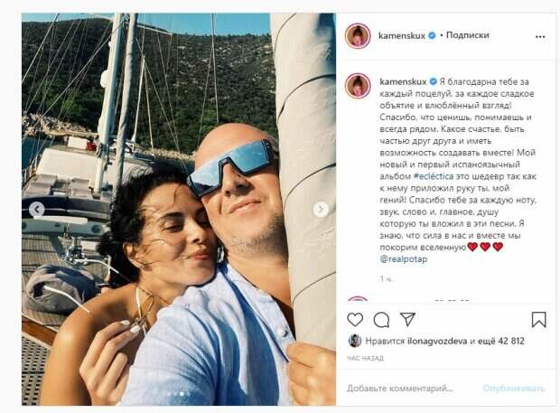 Известная певица Настя Каменских показала себя и своего супруга - Потапа (Алексея Потапенко) На фото красотка была в желтых прозрачных очках и белом купальнике. Рядом можно увидеть Алексея в рубашке и черных очках. Настя закрыла глаза от удовольствия, а Потап делал фото, показывая вид на яхте. Парочка показалась на нескольких кадрах, где можно заметить только любовь и восхищение друг другом.