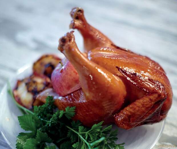 Приветствую вас, друзья, вы правильно сделали, что зашли, потому что сейчас я покажу один необыкновенный рецепт. На семейный праздник приготовил очень красивую и душистую курицу целиком. Сверху она была покрыта медовой глазурью, а внутри спрятались фрукты. Их сок пропитал мясо, поэтому оно ароматное и сочное.