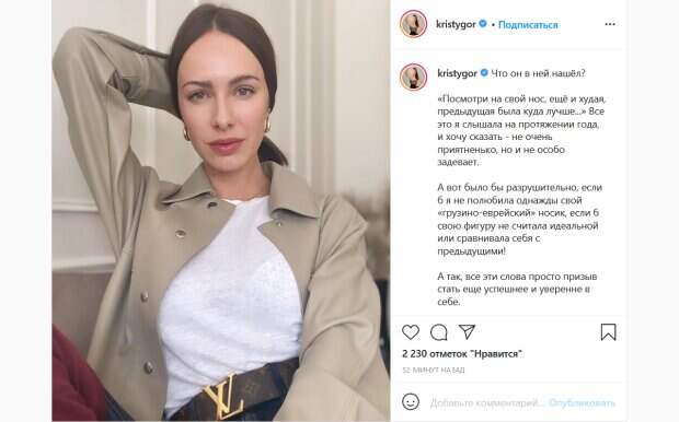 net. Среди прочего, люди обсуждали ее не идеальную внешность. «Что он в ней нашёл? «Посмотри на свой нос, ещё и худая, предыдущая была куда лучше...» Все это я слышала на протяжении года, и хочу сказать - не очень приятненько, но и не особо задевает», - призналась Горняк. Она считает, что если бы эта критика заставила ее возненавидеть свою внешность, это было бы действительно разрушительным. «А так, все эти слова просто призыв стать еще успешнее и увереннее в себе», - заявила жена Остапчука. Она добавила, что внешность – далеко не самое главное при выборе партнера. Подписчики Кристины тут же отреагировали на ее пост. «Однозначно он в вас нашёл энергию, блеск в глазах, женственность, друга, заботу ...а что мужчине ещё надо? Ну и конечно же вы красотка, чего уж там», «Через пару лет мужчина разберётся и финиш», «Всем не угодишь. Надо любить себя», - пишут люди. Напомним, жена Остапчука без грама косметики ошеломила признанием: "Вовчик всегда мне...". Как сообщала Politeka, Остапчук отомстил Кухар из "Танців з зірками", устроив ей разнос прямо на спектакле: "Кто-то у нас стал...". Также Politeka писала, что новая жена Остапчука раскрыла, на что пошел ради нее ведущий накануне свадьбы: "Если мужчина хочет. ..".