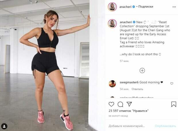 Звезда позировала в пустом помещении, немного выгнувшись, хвастаясь своими великолепными формами - такая шалунья. Модель была в топике, обтянувшем ее шикарную грудь. Пикантности добавила одна деталь - молния посередине. Чери расстегнула топик, чтобы лучше показать свои "богатства" под ним. Облегающие шортики с кокетливыми завязочками по бокам также придавали образу некой откровенности. Звезда сжала ткань по бокам, приподняв шортики и тем самым во всей красе засветив накаченные ножки. Черный лук фитнес-модель завершила игривыми розовыми кроссовками. Почти за час пост собрал более 20 тысяч лайков и много комментариев. Пользователи сети написали звезде массу приятных сообщений. Напомним, Ана Чери снимала себя в зеркало в спортзале. Модель позировала в черном топике, оголив немного часть своего упругого животика. Также звезда позировала в бирюзовых шортиках, обтянувших ее совершенные бедра. Модель разговаривала с подписчиками, когда парень позади попросил ее заниматься делом. Ранее мы писали, что Ана Чери позировала в купальнике насыщенного бордового оттенка, который намерено слишком сильно сжался на груди и талии. Мини-бикини просто поражало красотой на роскошном теле. Напомним, что знойная модель Ана Чери посветила своими "черешенками" прямо на столе: "Десерт готов!". А еще Politeka писала, Ана Чери в крохотном наряде изогнулась до неприличия: «Прикрой сейчас же!». Также Politeka сообщала, что роскошная Ана Чери показала, чем привлекает мужчин: "От напряжения корсет трещит"
