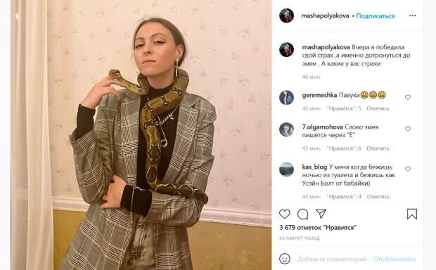 Были среди них и змеи, которых Полякова-младшая панически боится. Однако, певица настояла, чтобы девочка потрогала змею, и в итоге Маша все же смогла найти к ним подход. На новом фото юная Полякова уверенно позирует со змеей на шее. Девушка выглядит немного напряженно, но в целом для нее это явный прогресс. Для праздника Маша выбрала стильный наряд в виде серого брючного костюма в клетку. «Вчера я победила свой страх, а именно дотронуться до змеи. А какие у вас страхи?», - написала девушка в подписи к снимку. Ее подписчики тут же отреагировали на пост. «Клин клином вышибают», «Молодец, так держать», «Чудесная», «Змейка няшик и ты тоже!», «это было смешно», «Фото с подругой?», - писали люди. Отметим, что Оля Полякова накануне показывала, как Маша пытается пересилить себя и прикоснуться к змее. У девушки была настоящая истерика: она даже расплакалась. «Ты меня заставляешь трогать змею, я их панически боюсь», - говорила она на видео в «Сторис». Напомним, истерика случилась у дочери Оли Поляковой, праздник превратился в испытание: "Он душит тебя? О, Боже!". Как сообщала Politeka, 15-летняя дочь Поляковой в черном обратилась к украинцам, новое фото: "Дай Бог, чтобы...". Также Politeka писала, что 15-летняя дочь Поляковой в купальнике показала, как нужно наслаждаться жизнью: «Скажи спасибо, что у тебя такая…».