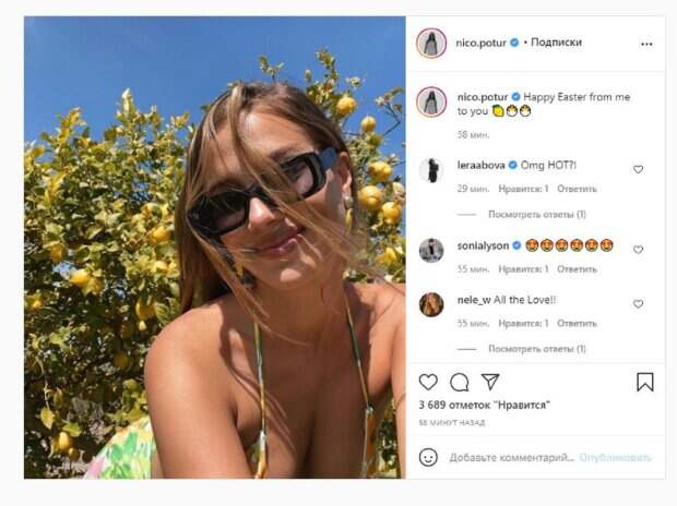И модель легко использует эту известность, подогревая интерес к себе пикантными фото в Инстаграм. Этот раз не стал исключением, ведь Николь появилась в наряде с декольте, нагнувшись перед камерой. Образ красотка дополнила стильными очками, позируя у лимонных деревьев. "С Пасхой от меня тебе", - написала красотка. Фанаты поставили более трех тысяч лайков и написали комментарии: "Омг, горячая", "Всем любви !!", "Любимый пасхальный кролик", "С Пасхой тебя и твою семью, красавица", "Идеальная", "Похоже, в Берлине поздняя весна! С праздником Пасхи". Мы писали, что 27-летняя модель из Германии Николь Потуральски поразила поклонников нежным видео. Так, на записи ее можно увидеть в черных трусиках и топе, бегущей по лугу с овцами. Затем мы видим Николь на кресле у окна. Она прикрыла глаза под лучами солнца, а камера выхватывает черное бикини на завязочках, поверх которого накинута просторная белая рубашка. Напомним, экс-любовница Брэда Питта раззадорила своими сочными "ягодками", распахнув рубашку А еще Politeka писала, что экс-любовница Брэда Питта в "небесном" бикини заставила мужчин пускать слюнки Также Politeka сообщала, что горячая экс-любовница Брэда Питта в необычном бикини показала свои главные козыри