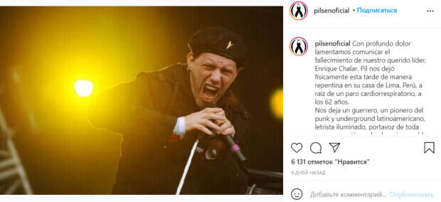 Панк-рокер умер после остановки сердца в своем доме Ветеран аргентинского панк-движения и пионер латиноамериканского панк-рока Пиль Трафа (настоящее имя Энрике Гектор Чалар) внезапно умер в возрасте 62 лет. Об этом сообщает InfoNews со ссылкой на заявление нынешней группы Пиля Pilsen. Немецкая группа Die Toten Hosen прощается со своим давним другом трогательными словами в Интернете.