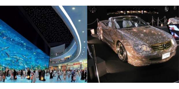 Вот только некоторые факты непомерных трат и роскоши в Дубаи. Летающий ресторан Единственный в мире полноценный закрытый горнолыжный курорт «Ски Дубай» расположен в торговом центре Mall of Emirates Горнолыжный курорт «Ски Дубай» Плавающая вилла за $2 млн Содержания диких зверей – вне закона. Но его постоянно нарушают и платят огромные штрафы Пока хозяин отлучился, птичка ждет. Стоимость такого сокола – несколько сотен тысяч долларов Автомобильный поток на городских улицах состоит только из люксовых авто Вот такая вот лошадь И это скачки. Посмотрите на экипировку наездников – цена от $50 тысяч, скаковой верблюд – больше миллиона $ Парк цветов Miracle Garden имеет территорию более 700 гектар, там работает больше 3000 человек, одновременно цветет почти миллиард цветов Милый котик В аквапарке «Айс Лэнд» кроме обычный бассейнов и горок есть ледяной ресторан. Посетителям выдают теплую одежду (одноразовую) и угощают горячими напитками – чаем, какао, глинтвейном Автомобиль для большой компании Машины будущего уже на дорогах Пирамида из черепах, которым от 100 до 200 лет Пассаж в одном из торговых центров – эти зонтики не подвешены, а парят благодаря особой технологии Золотой джип Мерседес, покрытый белым золотом, купили в первый же день продаж, цена почти $1 млн Теннисный корт Домашние питомцы имеют свой персонал и развлечения Еще один корт на крыше небоскреба Джакузи выше облаков Все золото не ниже 990 пробы Холл торгового центра Дамские кабриолеты, усыпанные камнями Сваровски Даже мусорный бак покрыт позолотой Доставка купленного авто покупателю