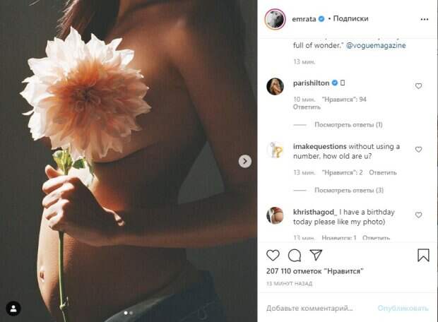 Также знаменитость поделилась своими переживаниями по поводу своей беременности. "Я слишком смиренна, чтобы иметь какое-либо ложное представление о контроле. Я полностью и неоспоримо беспомощна, когда дело доходит до почти все окружающего мою беременность: как мое тело будет меняться, кто будет мой ребенок. Но меня это на удивление не беспокоит. Вместо страха я чувствую новое чувство покоя. Я уже учусь у этого человека внутри своего тела. Я полна удивления", – подписала пост модель. Напомним, Эмили уже несколько лет состоит в браке с актером и продюсером Себастьяном Бир-Макклардом. Поженились они после того, как повстречались всего лишь несколько недель. Ранее мы писали, что Эмили Ратаковски продолжает интриговать образами в одном черном белье. Девушка поражает публику каждый раз, когда выходит в свет. Все дело в том, что она выглядит не только очень стройной, но еще и очень ухоженной. Эмили не любит макияж и боится испортить волосы укладками, потому ее часто можно заметить с распущенными и слегка спутанными волосами. Напомним, Ратаковски без белья и стыда дала заглянуть себе под пиджак А еще Politeka писала, что Эмили Ратаковски устроила шальной отдых на яхте в черном бикини Также Politeka сообщала, что Эмили Ратаковски устроила жаркие шалости в модном мини-бикини