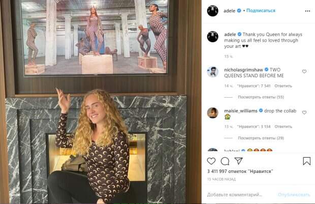 Певица Адель опубликовала фото, на котором она без макияжа Как передает Poltieka.net, необычным снимком звезда поделилась на своей страничке в Instagram. В кадре Адель без косметики позировала в облегающей одежде под телевизором, в то время как там была изображена Бейонсе в видео на песню Already. "Спасибо, королева, за то, что мы всегда чувствуем себя такими любимыми благодаря твоему искусству", - отметила она в подписи к снимку.