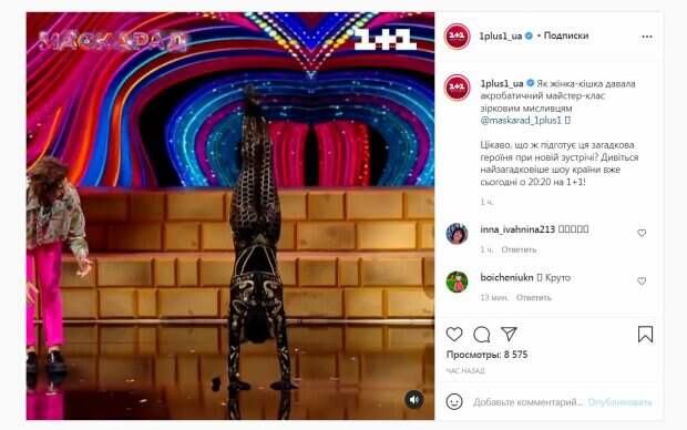 (Чтобы посмотреть видео, доскролльте до конца страницы) Один из охотников, певец Владимир Дантес, захотел повторить за героиней. "А есть что-то полегче, что может человек сделать?", - поинтересовался артист. В ответ женщина-кошка встала на руки. Другому члену судей, юмористу Игорю Ласточкину, показалось это движение под силу, однако устоял он верх ногами недолго. Другой охотник Юрий Ткач устоял на руках только с помощью Дантеса. Также героиня программы показала, как делает мостик. Владимиру Дантесу нелегко далась эта поза, и в конце он даже вскрикнул: "А! Спина!". "Как женщина-кошка давала акробатический мастер-класс звездным охотникам @ maskarad_1plus1
