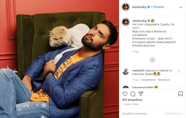 Он сидит в кресле, закинув ногу на ногу, а на плече у него примостился светло-рыжий кот, которого Виталий придерживает рукой за кончик хвоста. Снимок певец сопроводил своим же стихотворением: «Не стоит спрашивать Судьбу «За что?» Ведь путь наш в Жизни не случайный! Возможно лучше - «Для чего?» И в корне сделать вывод верный!». Поклонники не замешкались с комплиментами, причем многих интересовала порода кота, как оказалось. «Какая кися харизматичная😊👍», «Красивый, котик!🙂а, что за порода?», «Виталик, что это за порода кота?😻», «Ну молодчинка же !!!! Горжусь )», «Виталий, разве можно так похищать сердца девушек ?)))», – пишут в комментариях. Ранее мы рассказывали, что Козловский забрался в воду в одежде ради горячего кадра. На видео, опубликованном в соцсети, Виталий насквозь промокший выходит из речки на берег. На нем можно заметить белую футболку, ставшую полностью прозрачной после купания - благодаря этому хорошо заметен рельефный торс знаменитости. Кроме того, певец надел синие джинсы. К горячему видео Виталий Козловский добавил различные мультимедийные эффекты, которые сделали его еще более пикантным. Так на заднем плане по небу плывут облака, а на снимке появляются пятна и разводы. Вероятно, это кадр из нового клипа. Напомним, Козловский начал ныть и философствовать: что происходит с певцом. Как сообщала Politeka, Козловскому надоело молчать, певец раскрыл правду о своей ориентации. Также Politeka писала, что Козловский резко ответил на скандальное интервью Рамины.