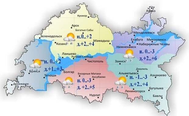 Днем температура воздуха будет не выше +1..+6˚. В Казани максимальная температура воздуха днем составит +2..+4˚. Ожидаются небольшие осадки в виде дождя и мокрого снега.
