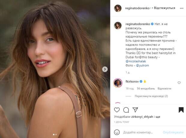 Так, недавно телезвезда отважилась на кардинальные перемены во внешности, и теперь показала фанатам яркое фото в совершенно новом образе. Как видно, на новом фото Регина запечатлена на отдыхе в одном из элитных отелей Дубая, а в подписи к публикации поделилась своими впечатлениями относительно ресторана при гостинице, в котором она побывала. На снимке красотка запечатлена за столом, на прогулку она вышла в стильном коричневом топе, который красиво подчеркнул декольте. Ее волосы здесь короткие после стрижки и небрежно уложены, а на лице нет макияжа, только милая улыбка. В подписи к фотографии Тодоренко рассказала об отеле, в котором отдыхает. "«Ужасный сервис», «жуткая еда», «грязный пляж» – все это точно не про новый клёвый отель! Я, как отельный гурман, приступлю к конструктивной критике. Начнём с еды…", - написала Регина и поделилась своими впечатлениями о ресторане, в котором ей очень понравилось. "Если у вас еще остались вопросы по этой теме, я готова ответить", - закончила она свой пост. В комментариях началась оживленная дискуссия, правда, поклонники обсуждают не отдых телеведущей, а ее новую прическу, которая многих здорово удивила. "Как вам идет эта прическа", "Регина, вы похожи на Анастейшу Стилл из "50 оттенков серого", "Похожи с Дорофеевой", "Дакоту Джонсон напомнила с этой стрижкой", "Как же иногда перемены важны и полезны", "С новой прической вы очень похожи на свою маму", - пишут в комментариях к фото. Напомним, Неизлечимо больная Тодоренко осталась без волос, поразив кадрами: "Такой меня еще никто не видел". Как сообщала Politeka, Неизлечимо больная Тодоренко из "Орла и решки" впервые показала последствия недуга: "Как у Майкла Джексона". Также Politeka писала, что Тодоренко сразу после Дженнифер Лопес заговорила о разводе прямо в отпуске: "Так огорчил меня...".