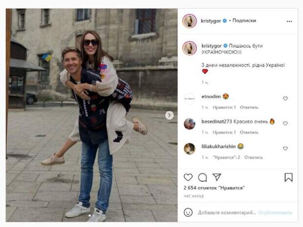 Сейчас телеведущий активно ведет социальные сети, как и новая супруга, где парочкка делится всем интересным. На новых фото, которые Кристина опубликовала в Инстаграм, красотка была в платье. Владимир надел вышиванку и джинсы. Девушка запрыгнула на мужа, крепко ухватившись за него. На втором фото парочка уже стояла рядом. "Горжусь быть украиночкой. С днем независимости, Украино", - написала Кристина. Фанаты поставили более 2 тысяч лайков и написали комментарии: "Красиво очень", "Какие вы классные", "Крошки хорошки", "Очень красивые", "Не плохо было бы еще начать общаться на украинском". Напомним, новая жена ведущего "Співають всі" Остапчука пожаловалась на недостатки отдыха с мужем А еще Politeka писала, что ведущий "Співають всі" Остапчук поделился радостью в особенный день и показал кольцо Также Politeka сообщала, что Остапчук засветил уставшую жену в постели после утех на пляже